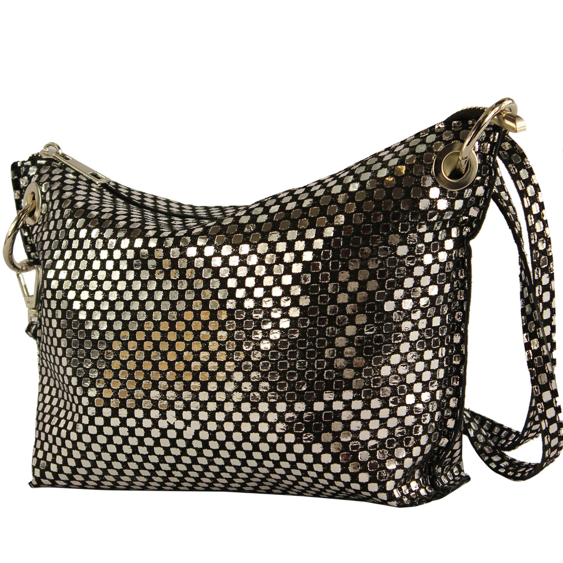 ! NEU ! Glitzernde Umhängetasche mit Silberdruck neu aus Italien eingetroffen * mit dieser tollen Tasche fallen Sie garantiert überall auf - der absolute Hingucker * ein ähnliches Modell mit goldfarbenen Metallteilen finden Sie unter modamoda T243 *