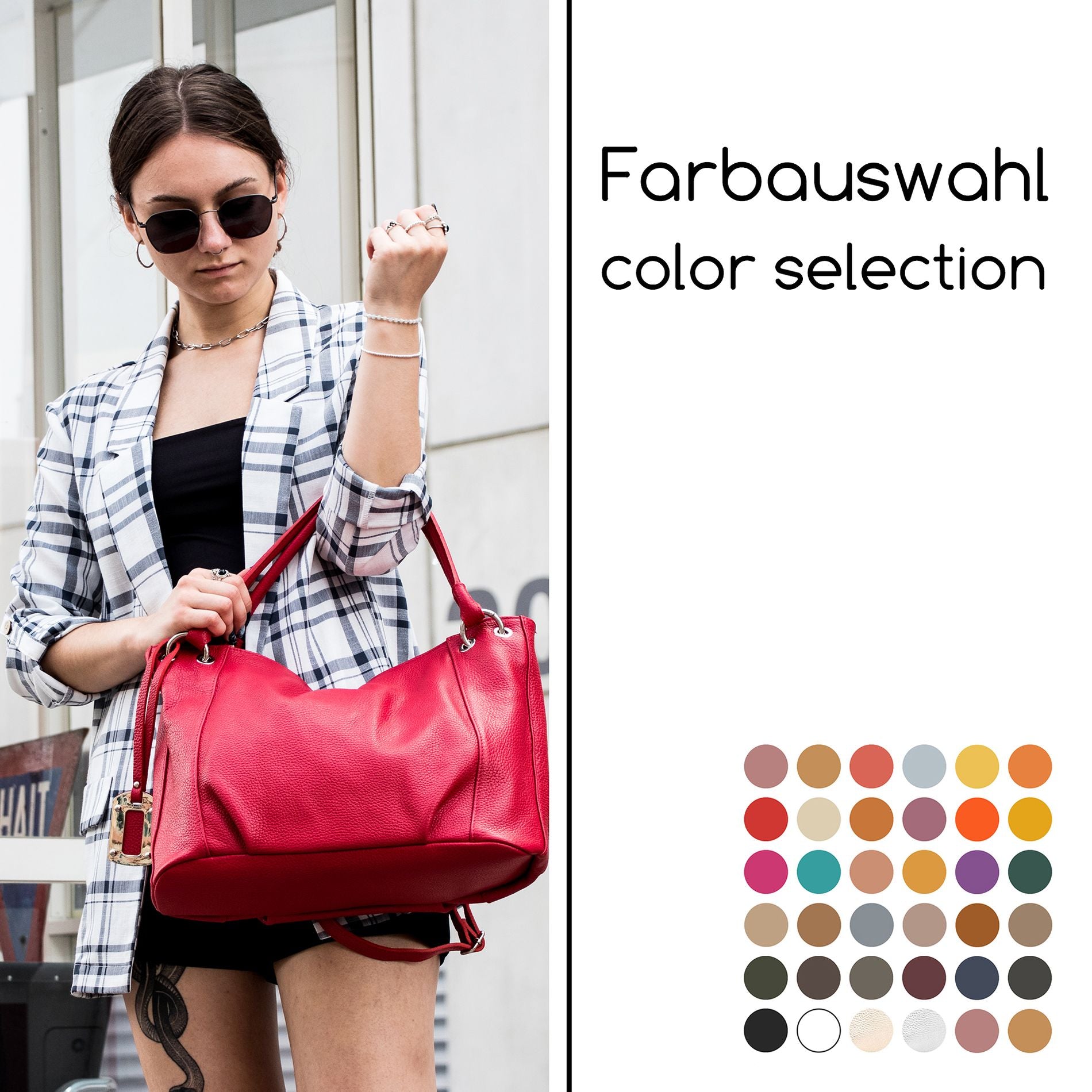 die geräumige Tasche aus weichem griffigen Leder ist mit Reißverschluss verschließbar - das sehr gut organisierte Hauptfach ist durch ein Mittelfach mit Reißverschluss geteilt - ausgestattet mit einem seitlichen Reißverschlussfach sowie zwei seitlichen Steckfächern - ein Sicherheitsfach mit Reißverschluss ist auf der Rückseite angebracht - alle Fächer sind für Ihr Smartphone geeignet - der dekorative Leder-/Metallanhänger ist abnehmbar - silberfarbene Metallteile - stabile abnehmbare Tragegriffe - verstärkter Boden - Innenmaterial aus Stoff - verstellbarer Schultergurt